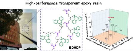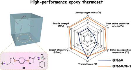 我院团队设计合成的两款阻燃剂因其磷-硼协同阻燃效应,能够在低添加量下(≤ 3wt%)赋予环氧树脂优异的阻燃及抑烟性能(极限氧指数> 31%,UL-94 V-0级,总烟释放量降低约20%)。同时,低聚物型阻燃剂的加入显著提升了环氧树脂的力学强度及韧性,并且保持其透光性。这两项工作提供了一种合成多功能含磷阻燃剂的有效策略,可用于制备高性能火安全环氧树脂,在电子电气、交通和建筑等领域具有潜在的应用前景。