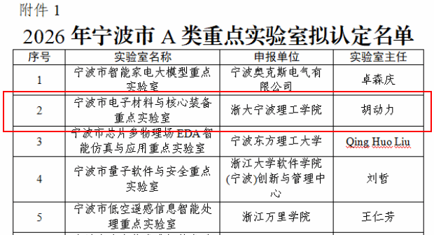 4月8日,宁波市科学技术局公布2026年度宁波市A类重点实验室认定名单,浙大宁波理工学院牵头建设的“宁波市电子材料与核心装备重点实验室”成功获批。学校紧扣国家重大战略与宁波“361”现代化产业体系发展需求,在集成电路、绿色能源和高端装备等领域持续发力,此次获批标志着学校科研平台建设取得重要突破。