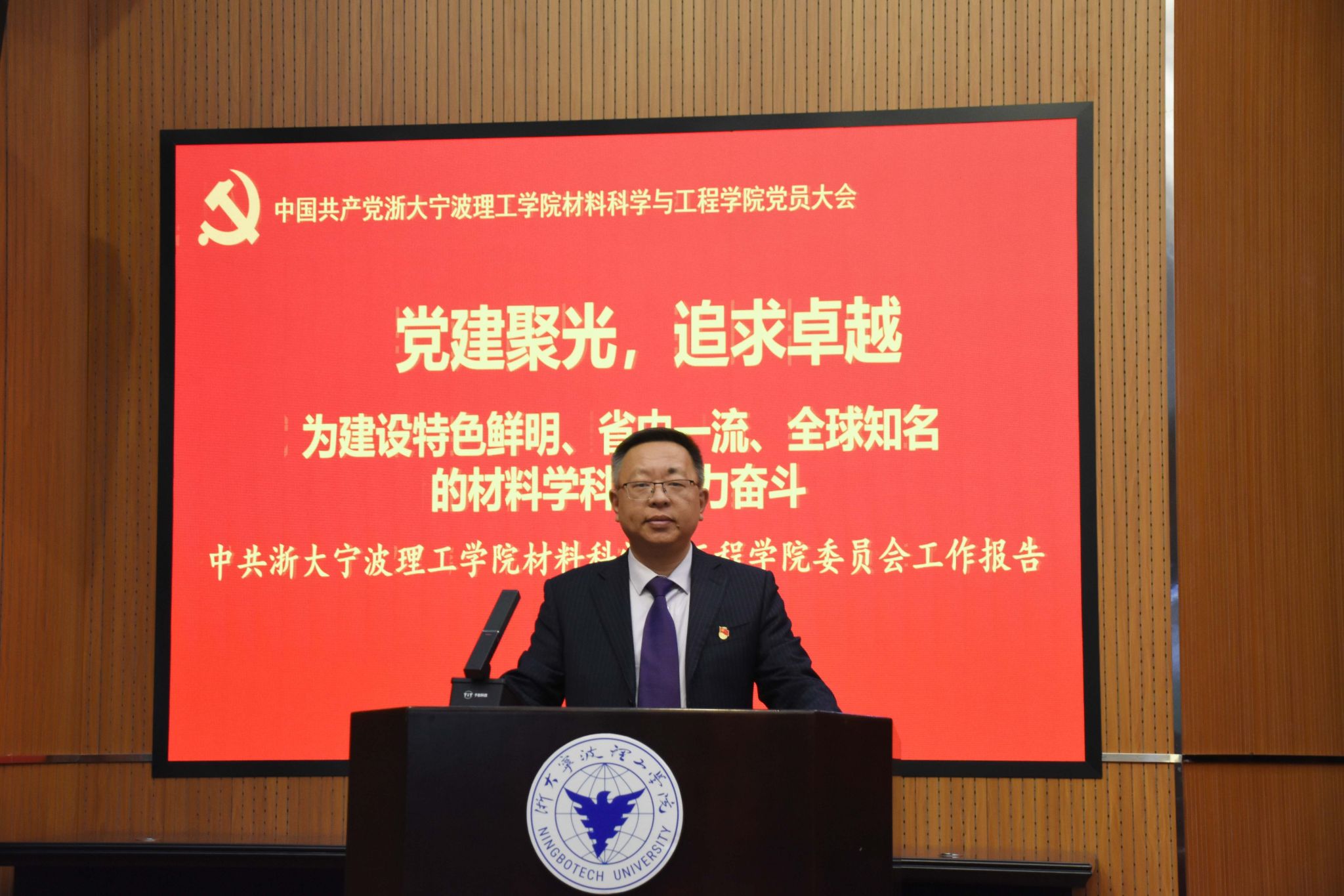 学院党委书记俞峰同志代表本届党委作了《党建聚光,追求卓越为建设特色鲜明、省内一流、全球知名的材料学科而努力奋斗》工作报告。报告全面回顾了学院本届党委的工作,总结了学院在党建创优、师资队伍建设、学科科研、人才培养等方面取得的成绩,同时客观分析了学院发展存在的问题与挑战,并提出了未来发展思路与工作举措。