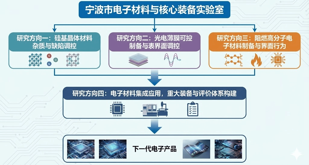 该实验室由浙大宁波理工学院研究员、国家重点研发计划首席科学家胡动力教授担任主任,中国科学院院士杨德仁教授担任学术委员会主任。实验室以电子材料为核心主线,围绕硅基晶体材料杂质与缺陷调控、光电薄膜可控制备及表界面调控、阻燃高分子电子材料制备与界面行为、电子材料集成应用与重大装备评价体系四大方向,构建“材料设计—材料与部件制备—工艺与装备集成—性能评价”的完整研究体系,并与多家行业骨干企业深度合作,推动科研成果落地转化。